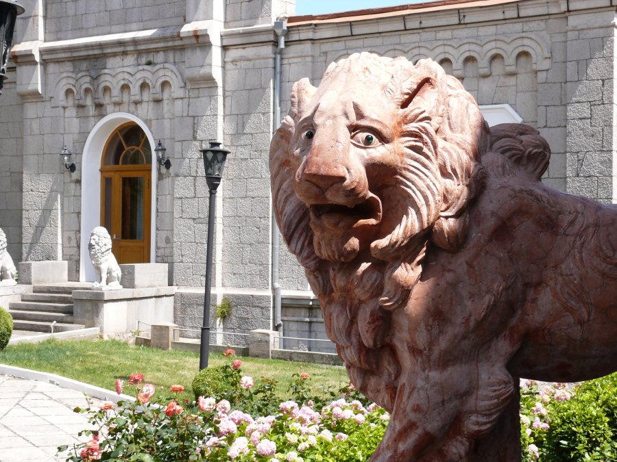 Гуляя по парку, можно увидеть ещё одну уникальную достопримечательность Кореиза. Поднимешь голову повыше – и узришь буквально парящий в небе… памятник Ленину. Он может смело претендовать на звание самого высокого в мире! Монумент возвышается на склоне, обращённом в сторону моря, как маяк. Своеобразный колосс, только не Родосский, а кореизский, недавно был окрашен золотой краской. Глядя на памятник Ленину, уже не удивляешься фантазиям Юсупова-старшего, который взял да и подарил супруге Зинаиде Николаевне на день рождения… Ай-Петри. В закатный час из окна столовой вид на гору особенно эффектен. Эта яркая игра света объясняется особенностью оконного стекла, изготовленного по методу хрусталя.